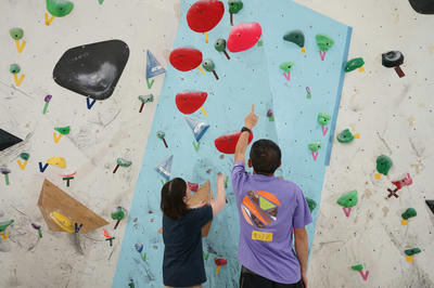 アイマスクを着用してクライマーになったり、声でホールドの位置を指示するサイトガイドになったり。