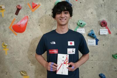 このたび広島から初のパラクライミングの日本代表選手が出たという事もあり、広島県山岳・スポーツクライミング連盟から激励の支援金カンパが募られました。そして当日は連盟の山田雅昭会長から、贈呈が行われました。