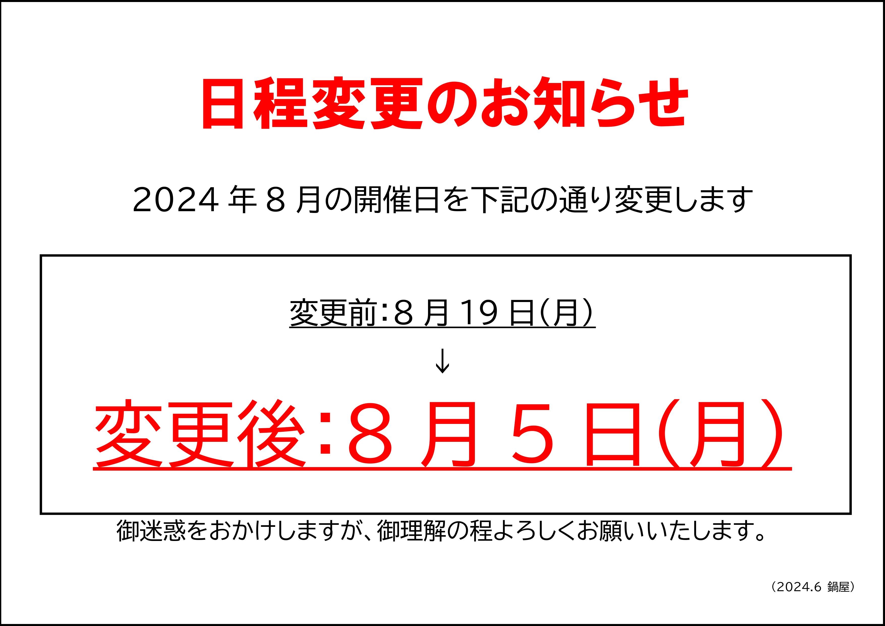 冒頭でも触れましたが8月は「第1月曜日」での開催、再来週にはもう開催日が迫っているのでご注意を。