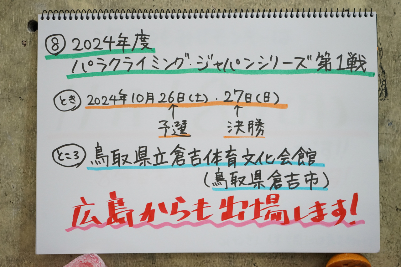 そして冒頭では10月26日(土)・27日(日)に鳥取県倉吉市で開催される「パラクライミング・ジャパンシリーズ第1戦」のお知らせも。