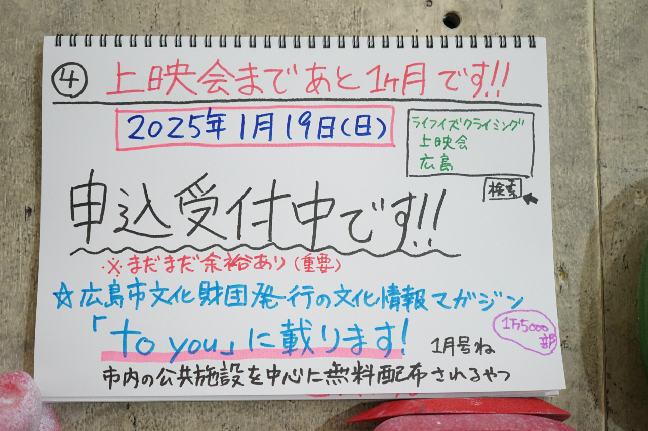 前日の2025年1月19日(日)には映画『ライフ・イズ・クライミング!』の上映会を開催しますが、それに合わせてスペシャルゲストとして広島に。そのまま翌日のもみじモンキーにも参加して下さる予定になっています。