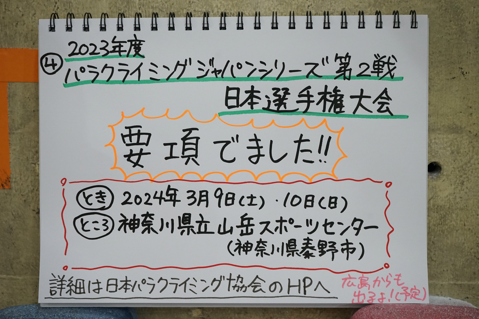 冒頭のお知らせコーナーでは「2023年度パラクライミングジャパンシリーズ第2戦・2023年度日本選手権大会」の要項発表をアナウンス。