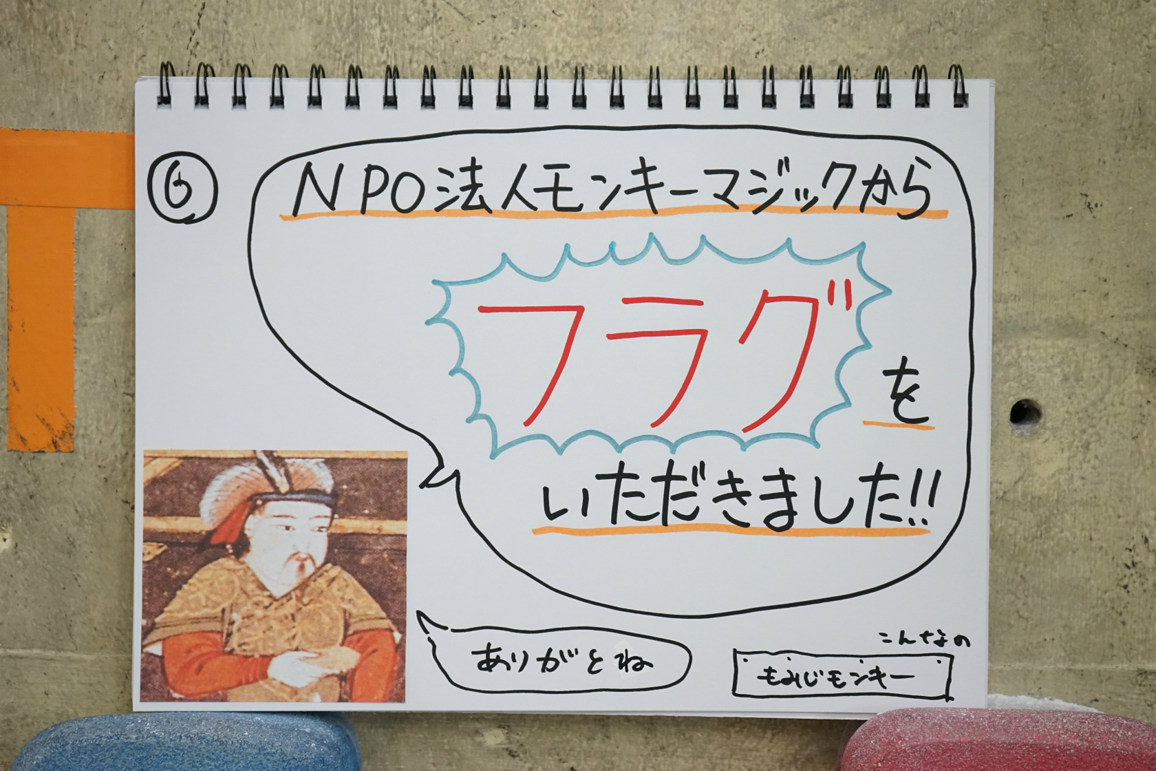 先月の投稿で触れたNPO法人 モンキーマジックから頂いたフラグ、集合写真を撮ると言っておきながらすっかり忘れて解散してしまったんですが、今月、ちゃんと撮りました!