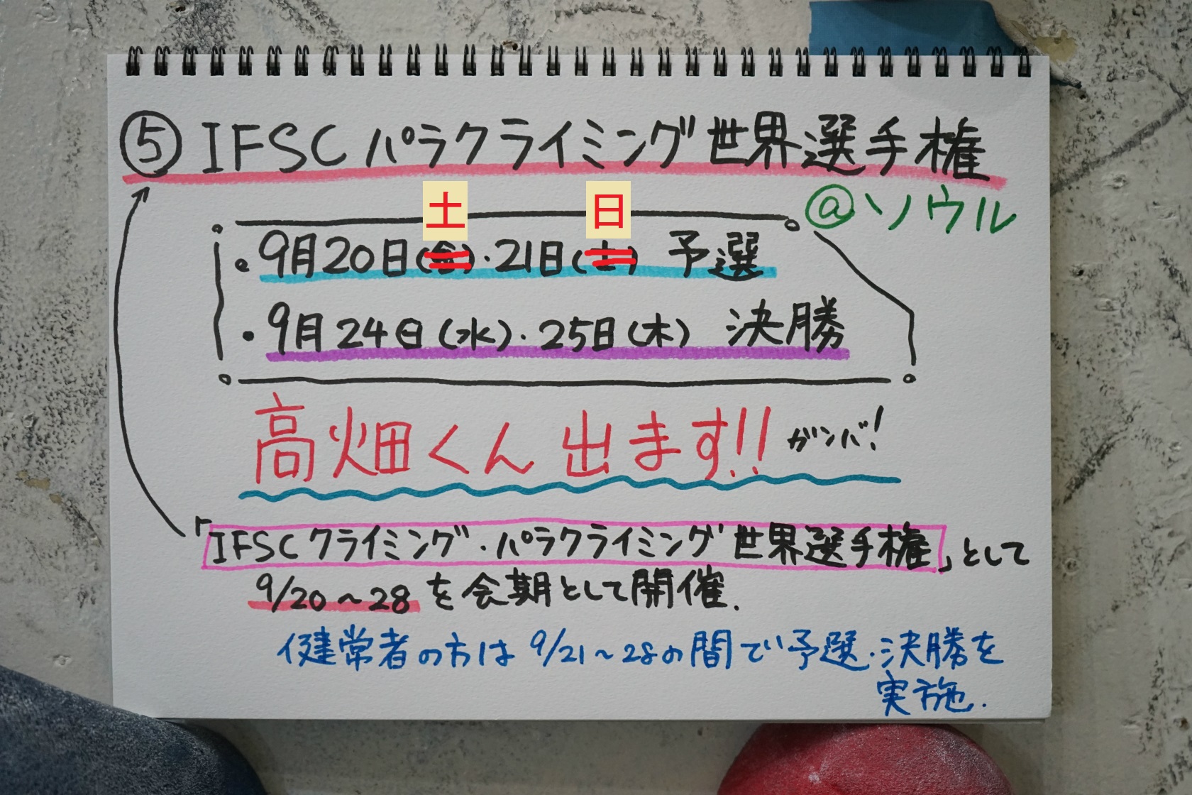 一つ目は来月ソウルで開催されるパラクライミング世界選手権について。