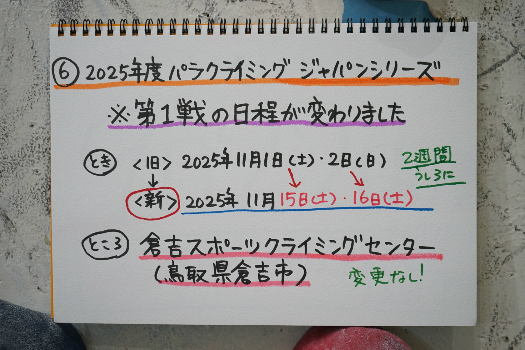 そうそうある事ではないので「何かあったんだろうな」とは思いますが、変に詮索するのもヨロシクないので、確定した日程で皆さん良いクライミングを見せて欲しいなと思います。