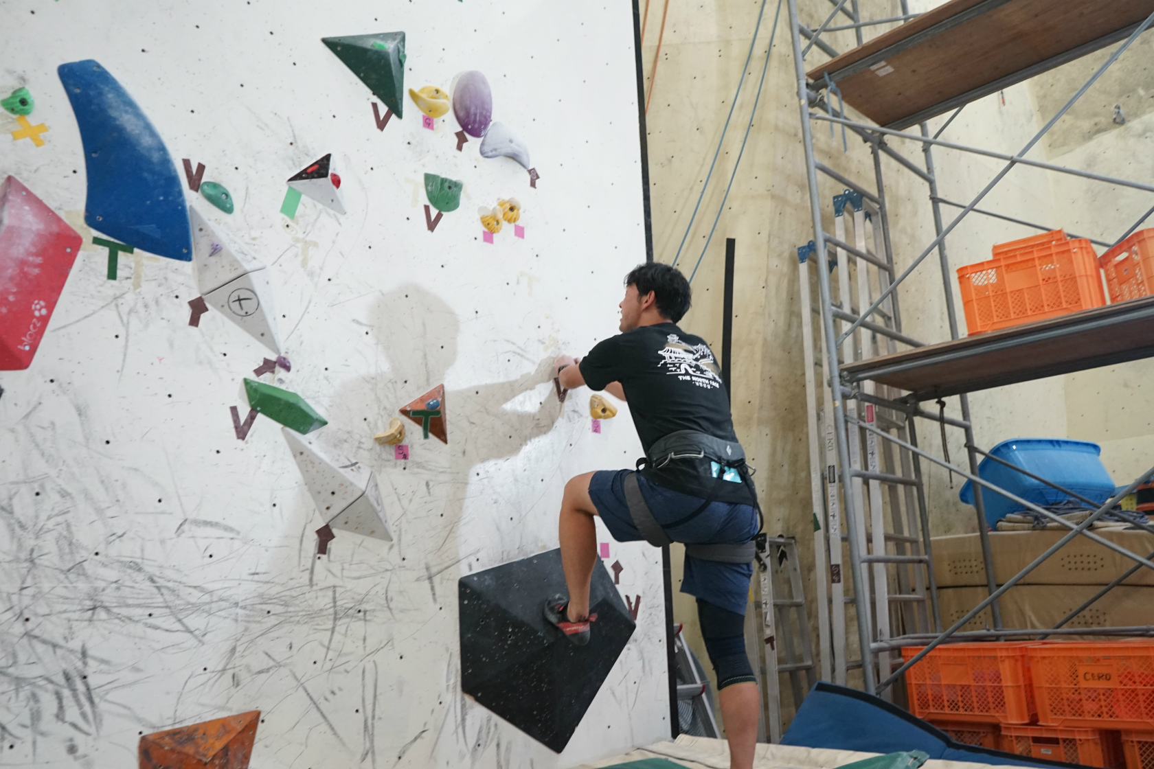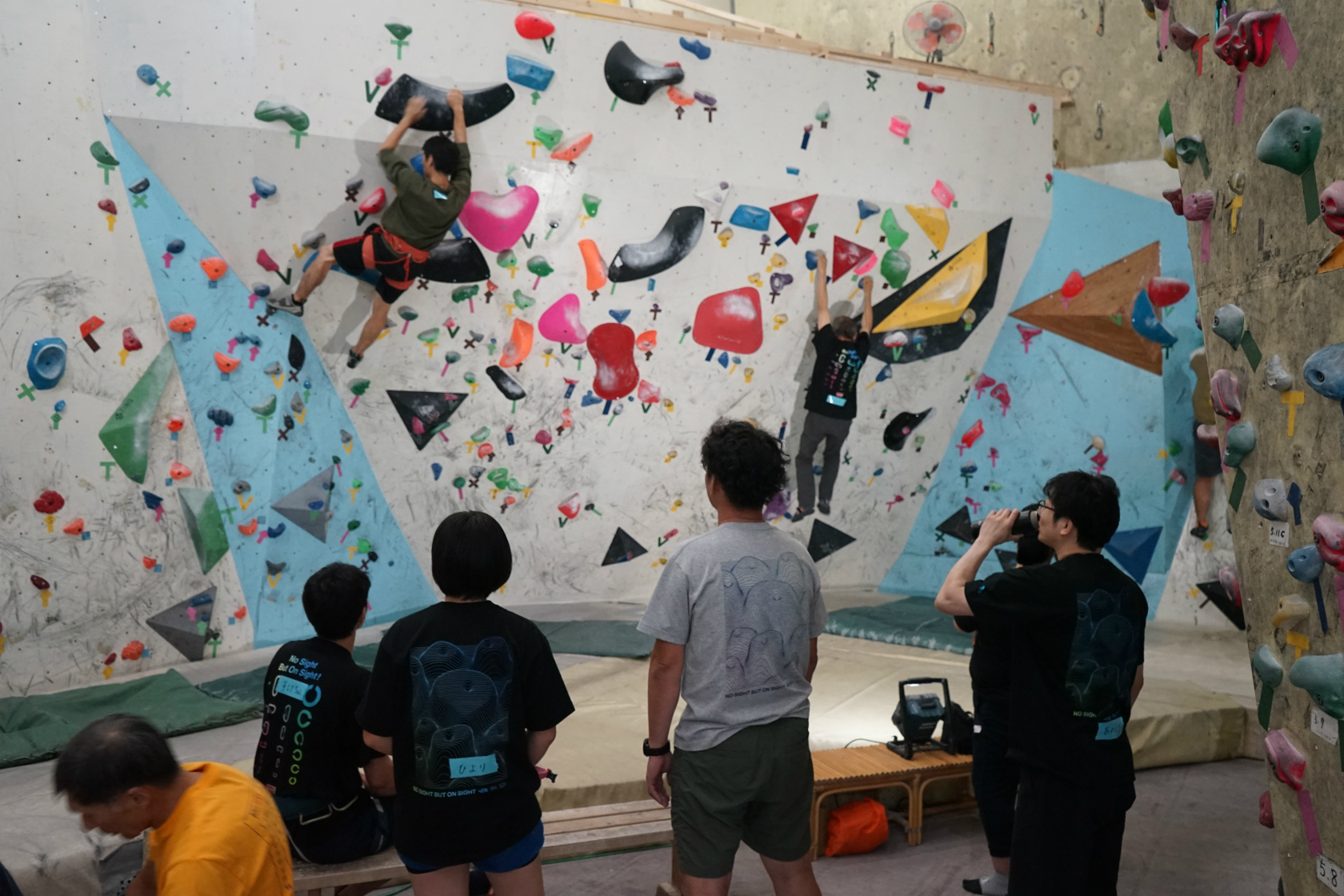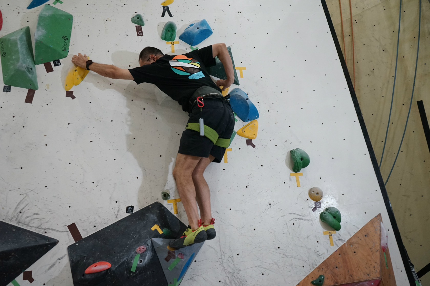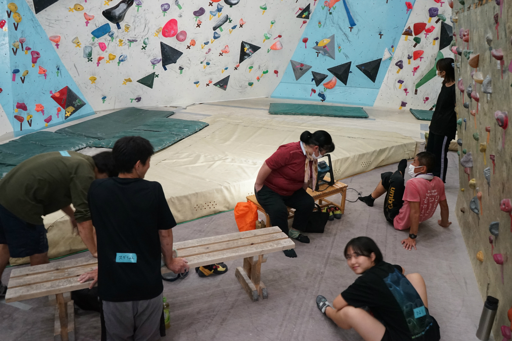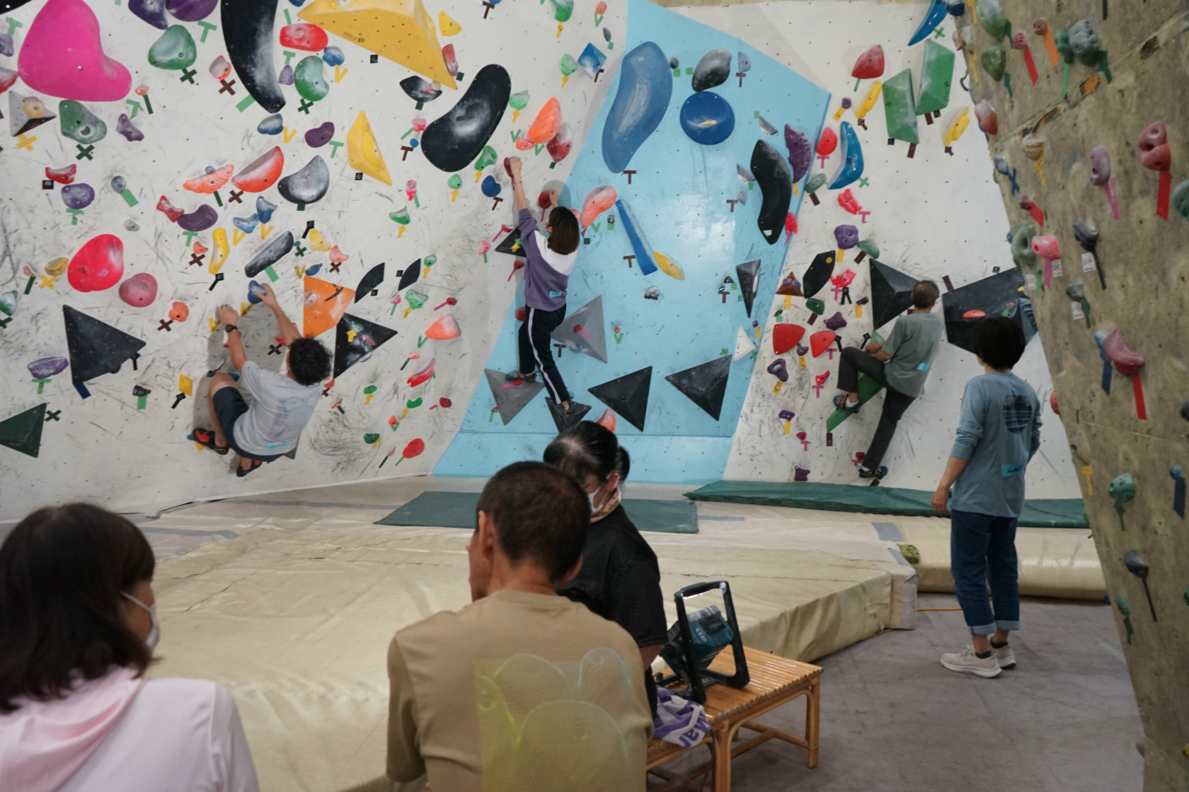 前回は久しぶりの2階ボルダー壁開催でしたが、今回はいつもの1階ボルダー壁が会場。ホールドチェンジも完了してまっさら新ルートがズラリ揃って我々を待ち構えてくれていました。