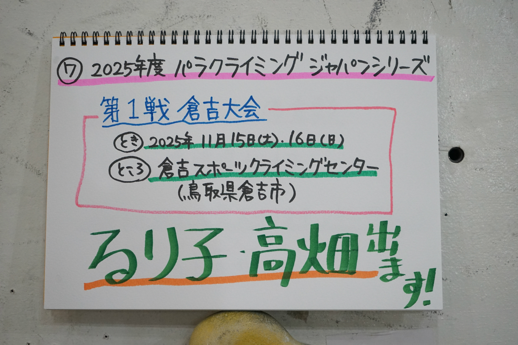 もう一つは先々月くらいからお知らせしている「パラクライミングジャパンシリーズ第1戦・倉吉大会」。JPCA=日本パラクライミング協会主催の全国大会の第一戦です。