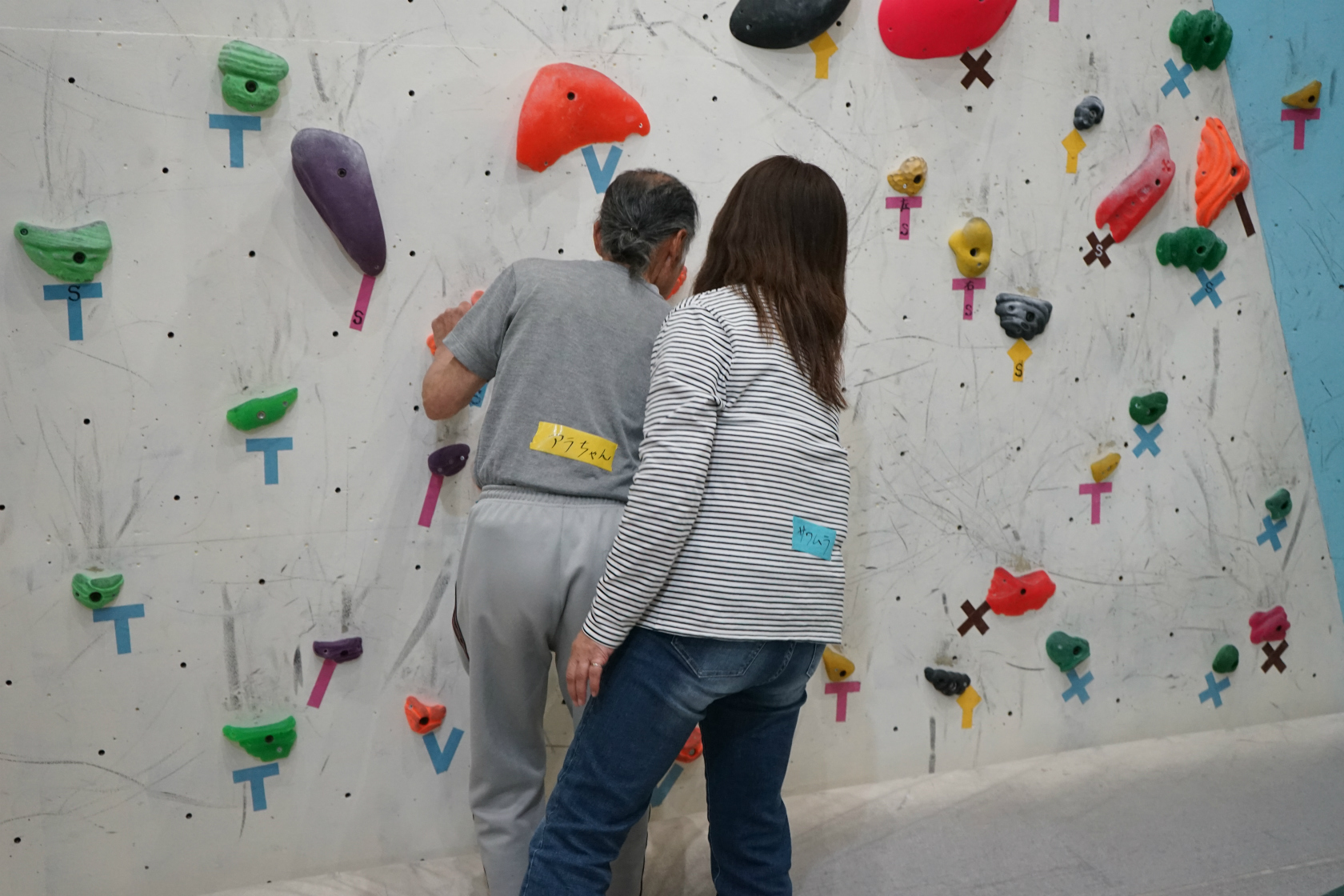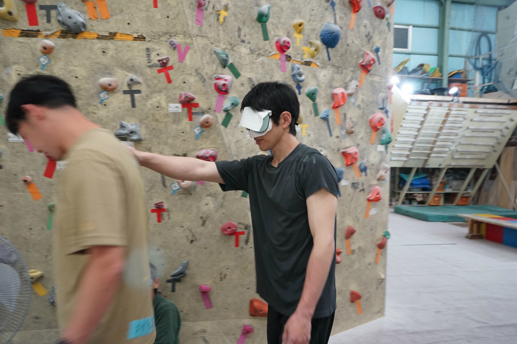 アイマスクを着用してクライマーになったり、声でホールドの位置を指示するサイトガイドになったり。