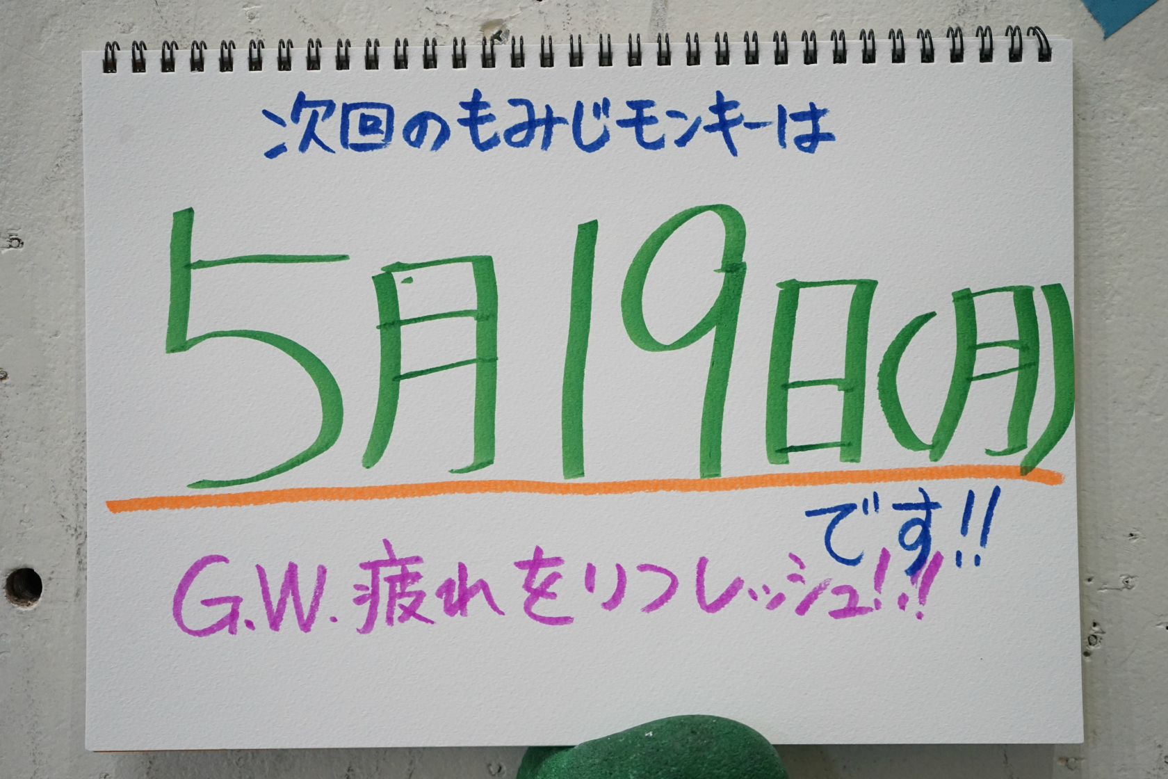 次回のもみじモンキーは【 5月19日(月) 】です!今回は一階ボルダー壁の改修をフィーチャーしましたが、実は二階ボルダー壁も大会を経てリセットされてまっさら新ルートが揃っています。一階よりも難易度は高めですが、腕試しにトライしてみるのもいいかも!?もちろん基本は「自分のペースで」。いろんな方の様々な楽しみ方をフォローできたらいいなと思っております。