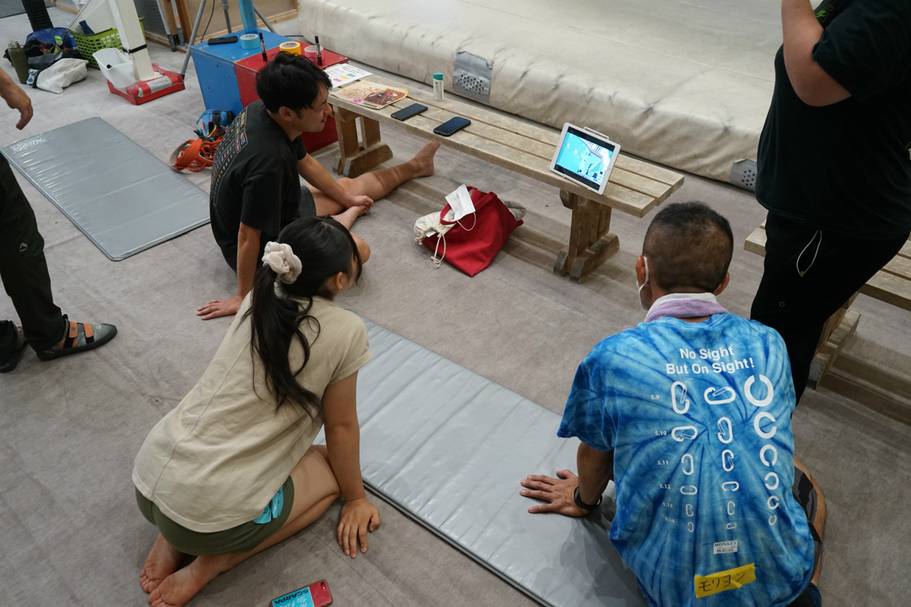 視覚障害がある参加者のクライミングの際はサイトガイドもつけて、さながら大会の時のような雰囲気に。「ロープを使ったクライミング自体が初めて」という方も、何だかんだで2本連登でフィニッシュという結果に、普段はボルダーが中心だけど、ロープもやっぱり楽しいよなと思った次第です。